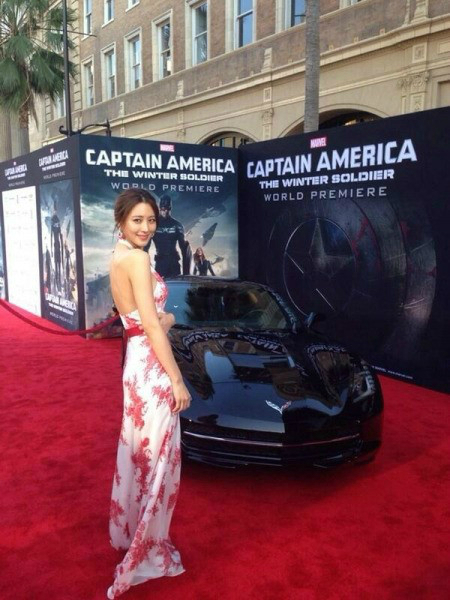 공개된 사진에서 수현은 영화 '캡틴 아메리카'의 포토월 앞에서 취재진을 향해 포즈를 취하고 있다.