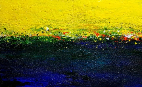 전통 오방색으로 원색안에서의 음양오행설을 이야기 하며, 밝음과 어두움, 기쁨과 슬픔 그렇듯 두 개의 색을 자연스레이 보여주며 캔퍼스 전체에 하얀 모래를 재료로 스스로의 몸을 던지듯 과감하고도 무섭게 뿌려대며 붓이 아닌 경륜으로 덮어내고 있다. 아무런 구성없이 잠재적인 요소를 근본으로 본능적 무한함으로 고단함을 요구하는 요즘 사회의 요구로부터 일탈성이 액션으로 보여지는 작업은 이러한 기점에서 전통적인 사고에 대한 가치,이상적인 사고의 영역을 부정하는 입장과 억제된 사고로서 연상의 실체성을 시사하고자 했다.