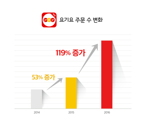 [류근원 기자] 배달음식 주문 앱 요기요(대표 나제원)가 2016년 주문 수 증가율이 119%로 집계돼 전년 대비 두 배 이상의 주문 수를 기록했다고 12일 밝혔다. 2015년에도 53%의 성장률을 보였는데 이를 훨씬 뛰어넘어 성장이 가속화 된 것이다.