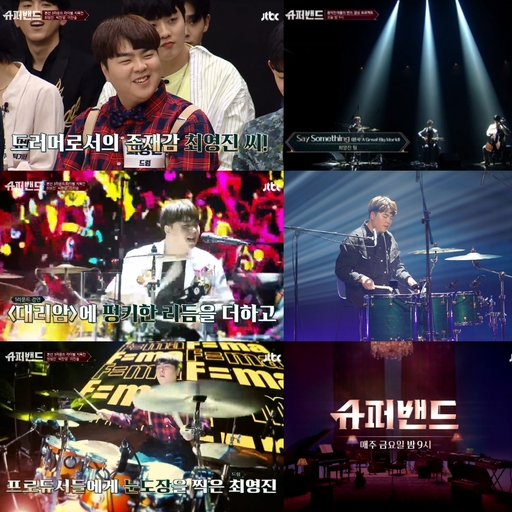 ‘슈퍼밴드’에 드러머로 참가한 최영진은 1, 2라운드에서 ‘과학쌤’ 프런트맨 안성진이 이끄는 ‘매드 사이언티스트 팀’의 일원으로 ‘수능금지곡’이라 불린 ‘대리암’과 ‘F=ma’를 선보였다. 굳건하게 팀원들의 사운드를 받쳐주던 그는 3라운드에서 처음으로 프런트맨에 임명돼, 보컬 이찬솔과 첼리스트 박찬영을 영입해 감미롭기 그지없는 ‘Say something’(원곡: A great big world)을 선보여 팀 승리를 이끌었다.