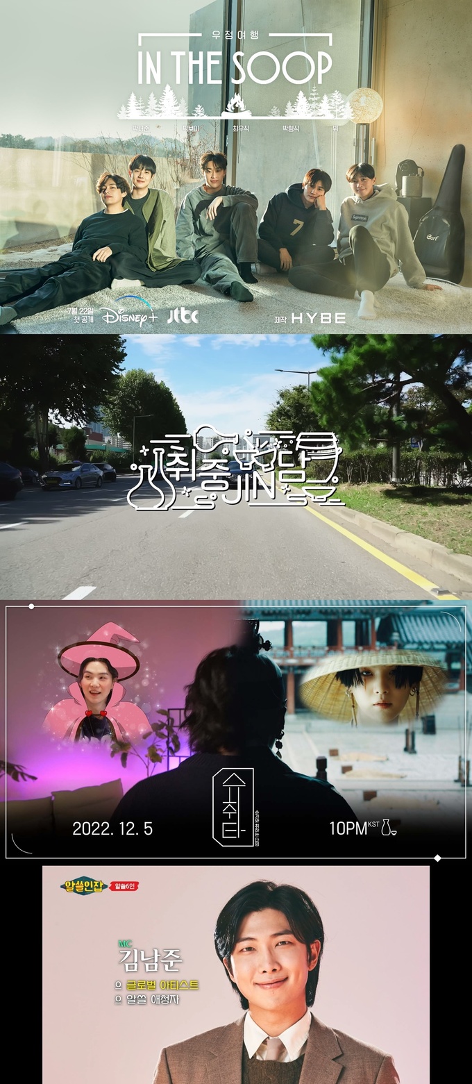 뷔는 절친인 박서준, 픽보이, 최우식, 박형식과 함께한 하이브의 오리지널 콘텐츠 ’인더숲 : 우정여행’을 통해 꾸밈없는 모습을 보여 주었다. 진은 백종원과 호흡을 맞춘 자체 콘텐츠 ‘취중진담’, SBS ‘런닝맨’에 출연해 열정 넘치는 모습을 보여 주었고, RM은 tvN ‘알쓸인잡’의 고정 MC로 발탁돼 색다른 매력을 알리고 있다.