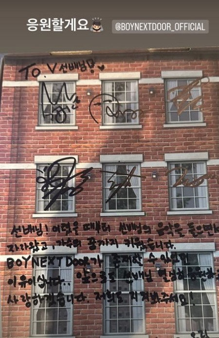 28일 뷔는 자신의 SNS에 “응원할게요”라는 한마디와 함께 보이넥스트도어 공식 계정을 태그하며 한 장의 사진을 공유했다. 사진에는 보이넥스트도어의 싸인 CD가 담겨 있다.