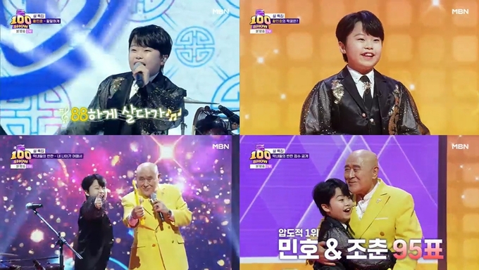 이어 '막내들의 반란' 팀으로 나선 황민호의 짝꿍이 공개됐다. 황민호는 '내 나이가 어때서' 무대를 시작했고, 이어 조춘이 등장해 함께 무대를 펼쳤다. 11세 황민호는 89세 조춘과 함께 짝꿍이 돼 78살 나이 차이가 무색한 듀엣 무대를 선사했다.