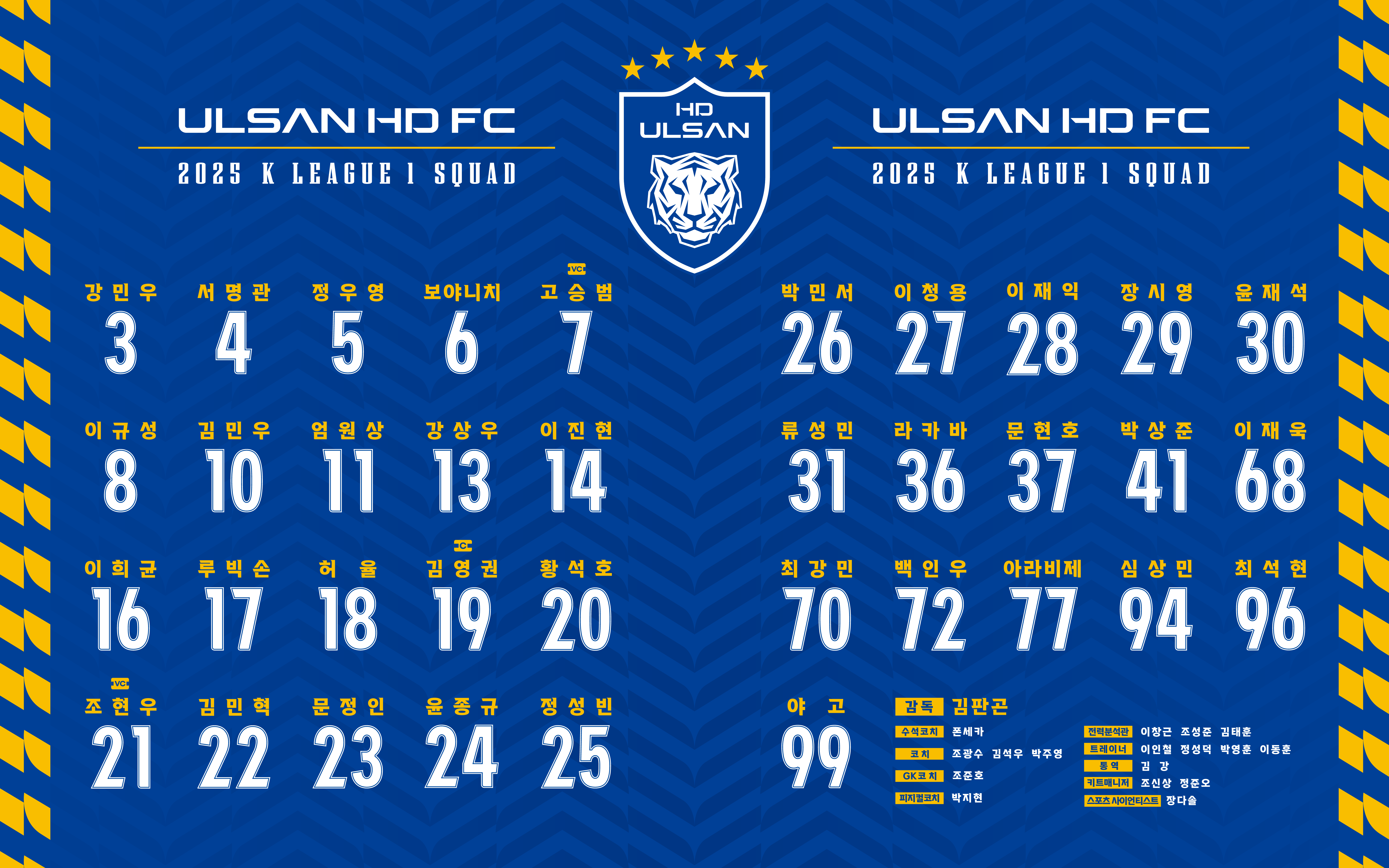 울산의 캡틴 김영권(19번)과 2024시즌 K리그1 최우수선수(MVP) 조현우(21번), 재계약으로 울산의 6년 차 블루 드래곤이 된 이청용(27번), 지난 시즌 울산의 K리그1 3연패에 혁혁한 공을 세운 고승범(7번)은 지난 시즌과 같은 번호를 단다. 반면 지난 시즌 중 팀에 합류한 정우영이 기존 32번에서 수비형 미드필더를 상징하는 5번으로 등번호를 바꾸며 새로운 출발을 알렸다.