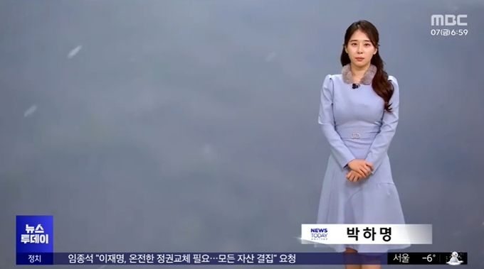 7일 방송된 MBC 뉴스투데이에서 박하명은 전국 곳곳 내려진 대설 특보를 전하며 날씨 상황을 전했다.