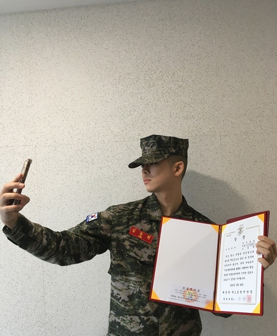 사진 속에서 그리는 해병대 군복을 입고 표창을 들고 포즈를 취하는 모습이 담겨 있다. 한층 늠름해진 그의 모습은 많은 이들의 이목을 끌었다.