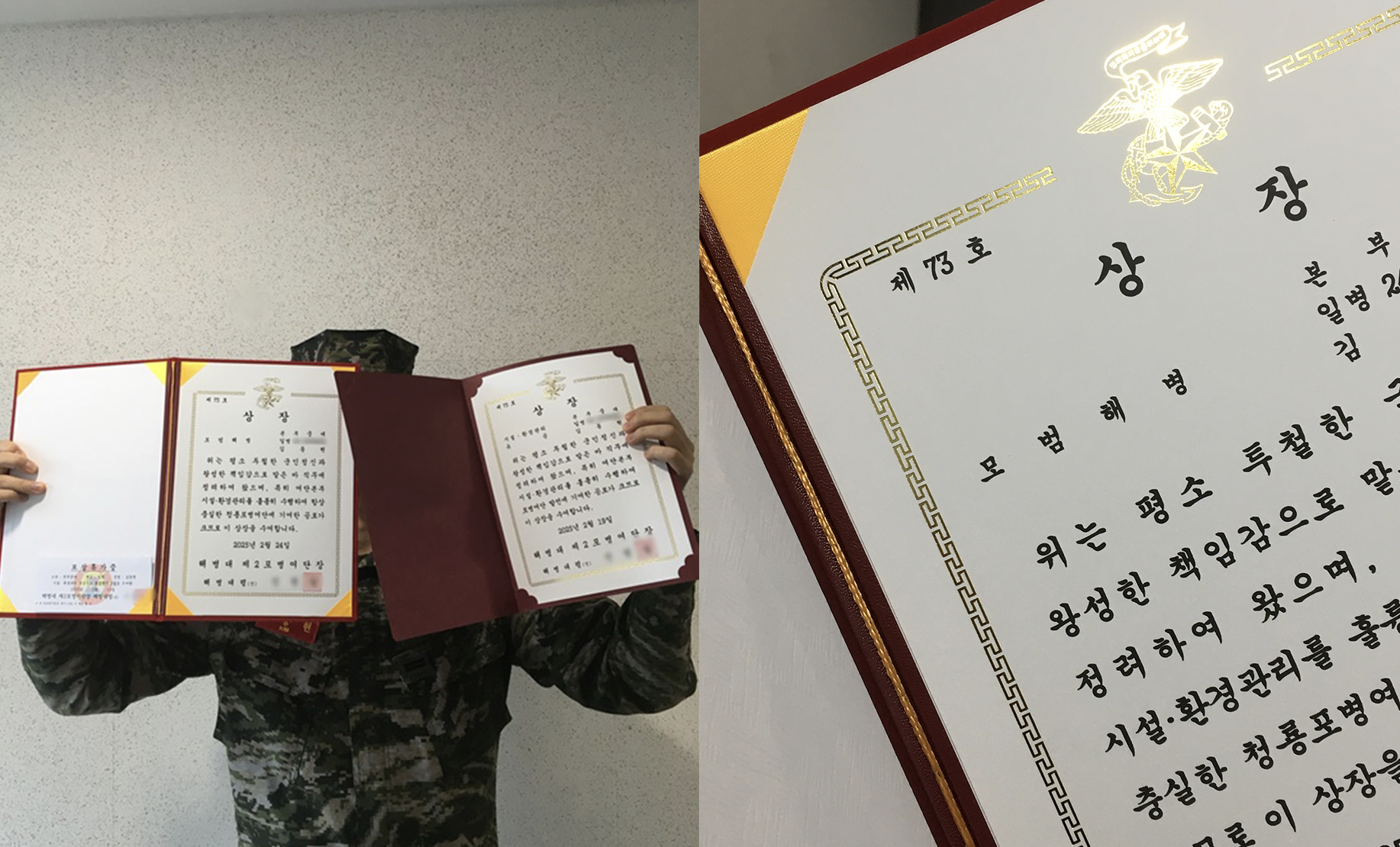 상장에는 ‘위는 평소 투철한 군인 정신과 왕성한 책임감으로 맡은 바 직무에 정려하여 왔으며, 특히 여단본부 시설·환경관리를 훌륭히 수행하여 항상 충실한 청룡포병여단에 기여한 공로가 크므로 이 상장을 수여합니다’라는 내용이 적혀있다. 또한, 모범 해병 상장 외에도 시설·환경 관리 유공 상장을 받은 사실이 놀라움을 자아냈다.