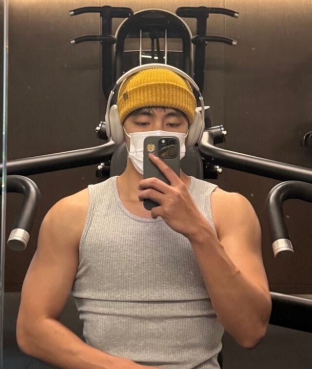 사진 속 뷔는 민소매를 입고 운동하는 모습으로, 군대에서 벌크업한 우람한 팔 근육을 자랑하고 있다. 그의 팔 근육은 입대 전보다 더욱 커져 팬들의 큰 관심을 모았다. 특히 비니와 마스크를 착용한 상태에서도 여전히 잘생긴 외모로 시선을 끌었다.