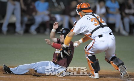 프로야구 한화 포수 신경현(오른쪽)이 11일 대전구장에서 열린 히어로즈와의 홈 경기 8회초 1사 2,3루 상황서 상대 김일경의 외야 플라이때 홈으로 뛰어드는 권도영을 아웃시키고 있다.