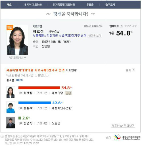 5일 6.4 지방선거 개표결과 서초구 제3선거구 시의원에 출마한 새누리당 최호정 후보가 당선됐다.