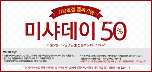 700호점 돌파 기념으로 마련했으며, 구매액과 제품수에 상관없이 20∼50% 할인이 적용된다는 게 회사측 설명. ‘미사 금설 수면크림’은 50% 할인을 적용해 2만7500원에, ‘미사 금설 기윤 아이크림’은 30% 할인을 적용해 2만9400원에 내놨다.