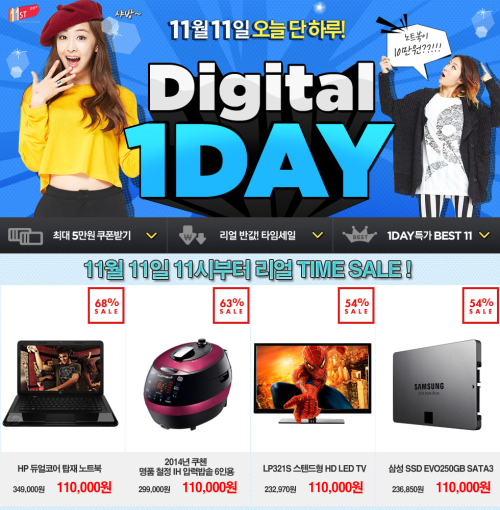 11번가(www.11st.co.kr)가 대표적으로, 11월 11일 ‘11번가 데이’를 맞아 500여개의 디지털가전 제품을 최대 68% 할인된 11만원 특가에 판매한다. 이날 오전 11시부터 오후 9시까지 2시간 간격으로 2종의 디지털 제품을 공개한다. HP 듀얼코어 노트북(34만9000원), 2014년 쿠첸 IH 6인용 압력밥솥(29만9000원), 한경희 온수매트(19만9000원), LG 24인치 LED 모니터(21만9000원), 쿠첸 에어워셔(19만8000원) 등 총 12종의 인기 디지털가전 500여개를 최대 68% 할인된 11만원에 만날 수 있다.