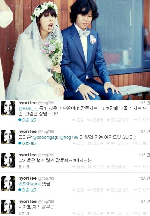 이효리는 12일 자신의 SNS에 "시차로 자긴 글른듯" "남자들은 왜 이렇게 빨리 잠들까요? 아시는 분" "특히 싸우고 속 끓이며 잠 못자는데 5초 만에 코골며 자는 모습. 그럴땐 정말" 등의 글을 남기며 유부녀가 된 자신의 심경을 밝혔다.