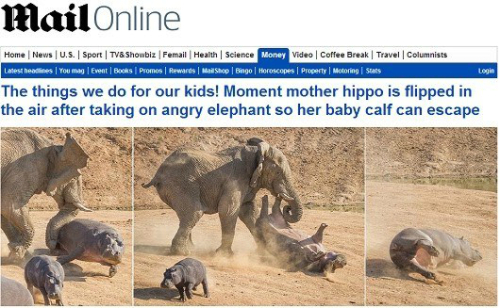 매체에 따르면 화난 코끼리가 새끼 하마를 공격하려 하자 어미 하마가 이를 막았고 코끼리의 코에 떠밀린 어미 하마는 공중으로 날아가 휙 하고 뒤집혔다. 어미 하마가 코끼리를 막는 동안 새끼 하마는 자리를 피해 안전한 곳으로 도망간다.