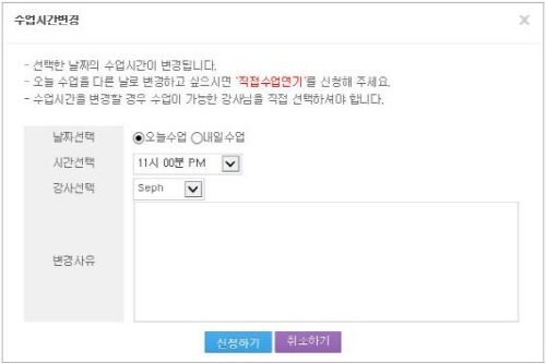 수업시간을 변경해야 할 때마다 고객센터에 전화해야 하는 불편함을 줄일 수 있으며, 수업 한 시간 전이면 언제든지 다른 시간으로 쉽게 변경이 가능하고, 강사 또한 선택이 가능하다.