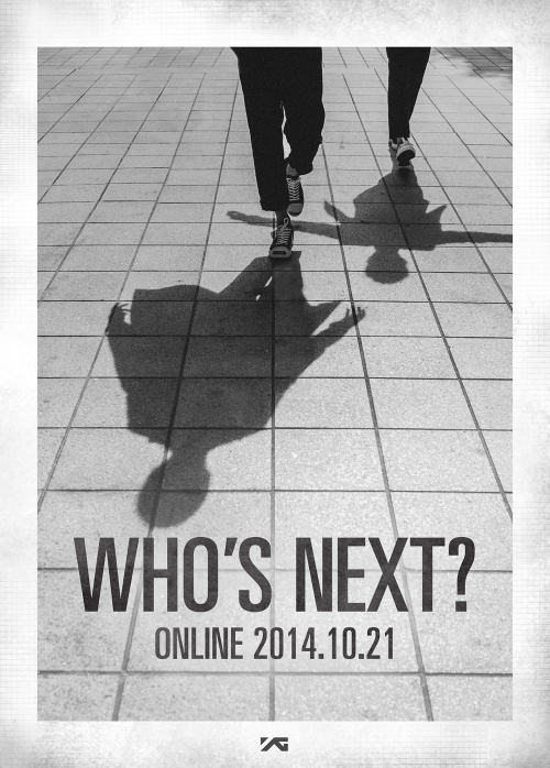 YG는 11일 오후 2시 YG공식블로그를 통해 ‘WHO IS NEXT’라는 문구가 적힌 티저를 공개했다. 거리를 걷는 두 사람과 이들의 그림자가 인상적인 티저 이미지에는 YG가 지난 8일 공개한 티저와 마찬가지로‘2014.10.21’이라는 구체적인 날짜와 시간이 명시돼 있어 기대감을 높이고 있다.