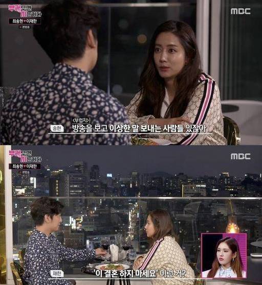 이후 두 사람은 자리를 옮겨 결혼 이야기를 이어갔다. 최송현은 결혼 승낙 후 불쾌한 메시지를 많이 받았다고 고백했다. 그는 “메시지로 이상한 말 하는 사람들 있지 않냐”고 했고, 이재한은 “‘이 결혼 하지 마세요’이런 거?”라고 되물었다.