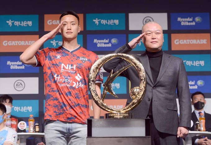 프로축구 김천 상무 김태완 감독(왼쪽)과 정승현이 14일 효창동 백범김구기념관에서 열린 '하나원큐 K-리그 2022 개막 미디어데이'에서 포즈를 취하고 있다. 사진=김두홍 기자 kimdh@sportsworldi.com 2022.02.14.