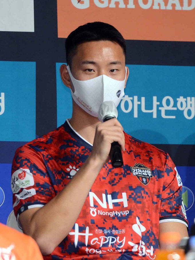 프로축구 김천 상무 정승현이 14일 효창동 백범김구기념관에서 열린 '하나원큐 K-리그 2022 개막 미디어데이'에서 출사표를 던지고 있다. 사진=김두홍 기자 kimdh@sportsworldi.com 2022.02.14.