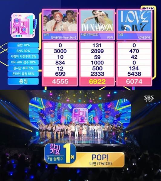 10일 방송된 SBS ‘인기가요’에서는 나연의 ‘POP!’, 아이브의 ‘LOVE DIVE’, 선미의 ‘열이올라요’가 7월 둘째 주 1위 후보에 올랐다.