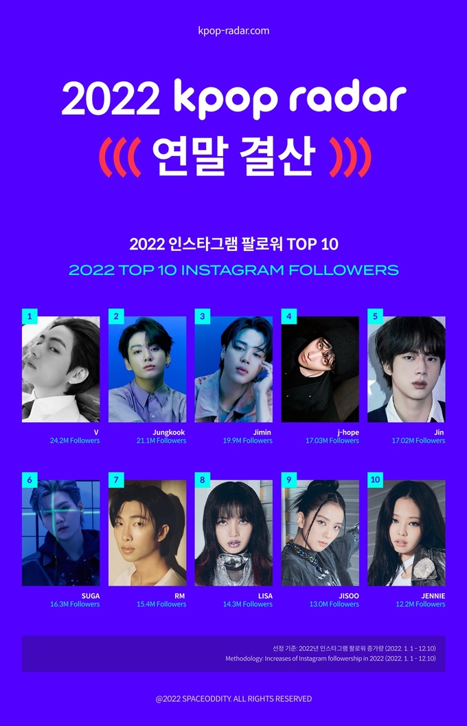 케이팝 전용 차트 프로그램 케이팝레이더는 최근 인스타그램 팔로워 부문 연말 결산 결과를 발표했다. 이번 결과는 지난해 1월 1일부터 12월 10일까지 집계된 인스타그램 팔로워 증가량을 기준으로 선정됐다.