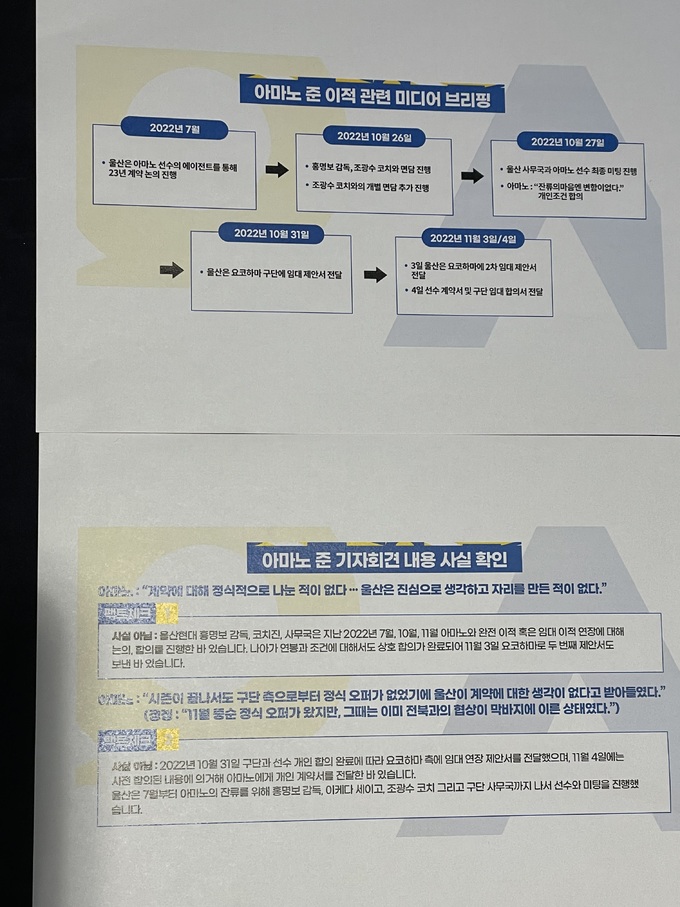 평행선이 좁혀지지 않자 울산은 아예 아마노 준 관련 미디어 브리핑을 진행했다. A4 용지 두 장의 PPT를 제작해 언론에 배포하며 아마노의 발언을 하나하나 사실확인을 했다.
