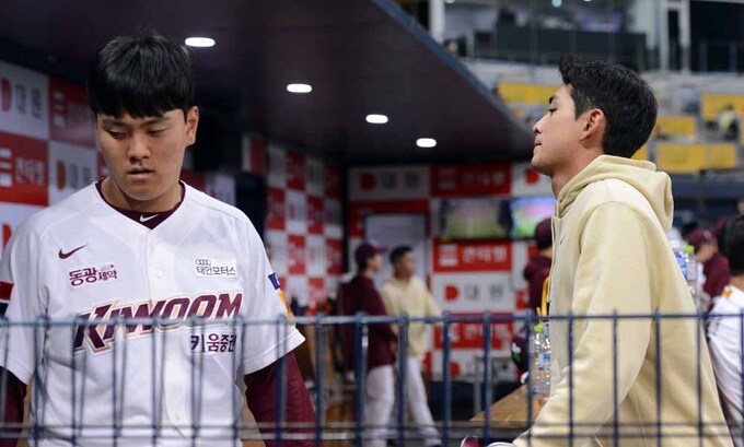 프로야구 키움 이정후(오른쪽)가 4일 고척스카이돔구장에서 열린 LG와의 경기를 지켜보다 안으로 들어가고 있다.