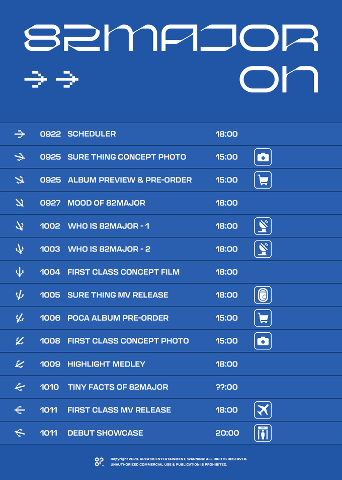 공개된 프로모션 캘린더에 따르면 82MAJOR는 오는 25일 선공개 타이틀곡 ‘SURE THING(슈어 띵)’ 콘셉트 포토를 통해 데뷔 프로모션의 포문을 연다. 27일에는 82MAJOR만의 무드가 담긴 영상이 업로드되는 한편, 내달 2일과 3일로 예정된 ’WHO IS 82MAJOR'는 과연 무엇일지 궁금증을 자극한다.