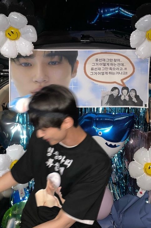 30일 변우석은 자신의 SNS에 “청상아리 류선재”라고 적으며 여러 장의 사진을 공개했다. 사진 속 변우석은 ‘청상아리 류선재’라고 적힌 티셔츠를 입은 채 팬들이 보내준 서포트 현수막 앞에서 웃음 짓고 있다.