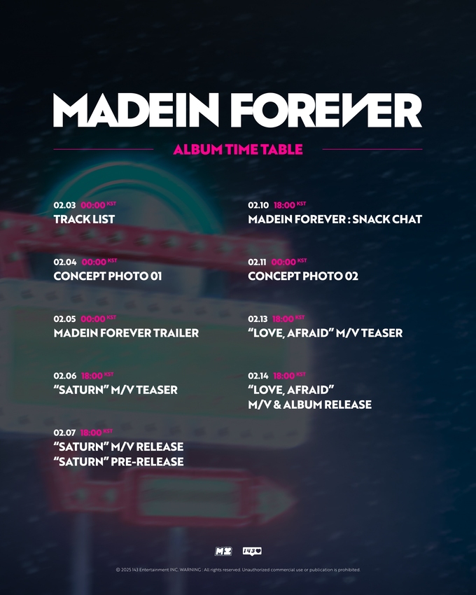 이뿐만 아니라 스케줄러 이미지 속 베일에 가려진 이정표가 이번 신보 콘셉트를 향한 궁금증을 자극한다. 앞서 데뷔 EP ‘상승’으로 청순한 하이틴 비주얼을 자랑했던 메이딘이 ‘MADEIN FOREVER’를 통해 선보일 색다른 변신에 팬들의 기대가 더해지고 있다.