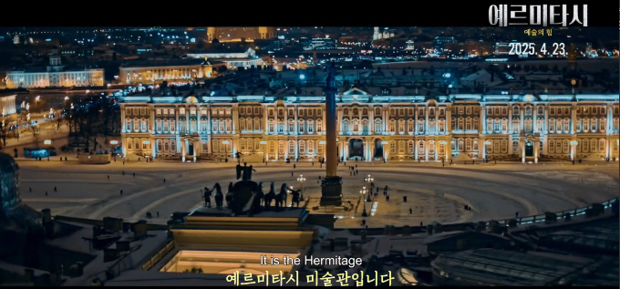 공개된 메인 예고편은 겨울궁전으로 불리는 예르미타시 미술관의 멋진 야경과 다양한 다리로 연결된 환상적인 도시의 모습부터 시선을 사로잡는다. 더불어 미술관 답게 소장된 고 미술품의 복제과정이 흥미롭게 펼쳐진다. 넓은 복도를 가득 메운 다양한 조각상을 비롯해 건물 내부에 장식된 화려한 색채의 프레스코화와 마티스의 대표작 춤, 카라바조의 류트 연주자 등이 등장하면 “예르미타시 미술관은 시간과 공간 감각을 잃어버리기 십상”이라며 배우 토니 세르빌로가 들려주는 해설도 기대감을 안겨준다.