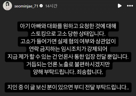 서민재는 16일 자신의 SNS에 한 매체와의 인터뷰를 캡처해 올리며 “아기 아빠와 대화를 원하고 요청한 것에 대해 스토킹으로 고소당한 상태“라며 “고소가 들어가면 실제 혐의 여부와 상관없이 연락 금지하는 임시조치가 강제되어 지금 제가 할 수 있는 건 언론사 통한 입장 전달뿐이다. 거듭되는 언론 노출로 불편하시겠지만 양해 부탁드린다. 지인 중 이 글 보신 분이 있으면 부디 전달 부탁드린다”고 읍소했다.