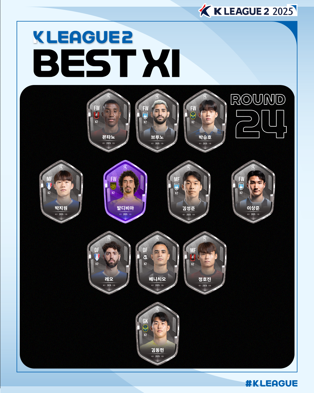 하나은행 K리그2 2025 24라운드 MVP는 전남 발디비아가 차지했다. 발디비아는 지난 10일 광양축구전용구장에서 열린 전남과 천안의 경기에서 해트트릭을 기록했다.