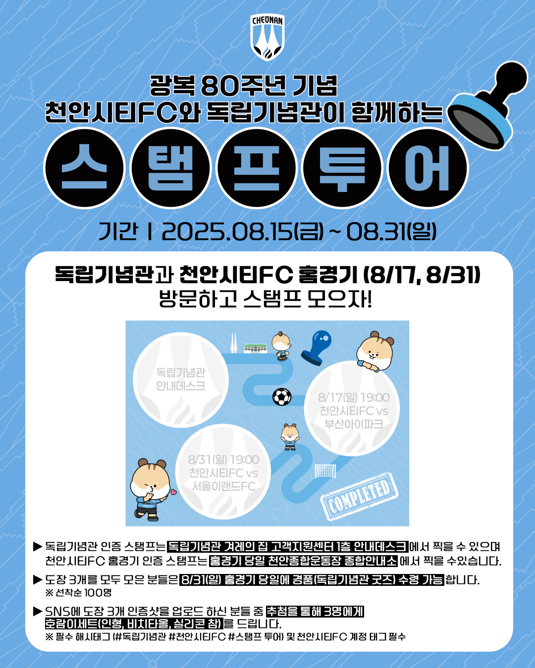프로축구 K리그2 천안시민프로축구단이 광복 80주년을 맞아 독립기념관과 함께 특별한 ‘스탬프 투어’를 진행한다. 이번 행사는 15일 광복절부터 31일까지 이어진다. 축구와 역사·문화 체험을 함께 즐길 수 있는 프로그램이다.