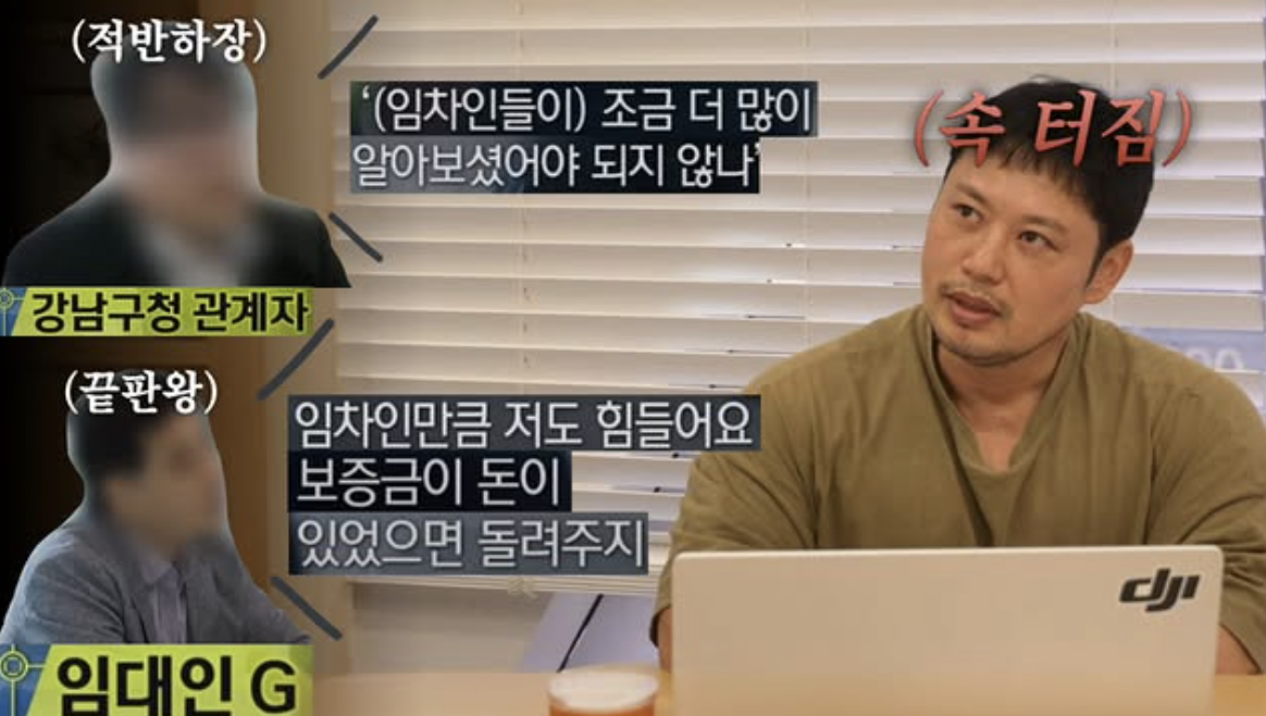 공개된 썸네일에는 강남구청 관계자가 “(임차인들이) 조금 더 많이 알아보셨어야 되지 않나”라는 발언과, 임대인이 “임차인만큼 저도 힘들다. 보증금이 돈이 있었으면 돌려주지 (않았겠나)”라고 말하는 장면이 담겨있다. 이를 듣고 답답한 표정을 짓는