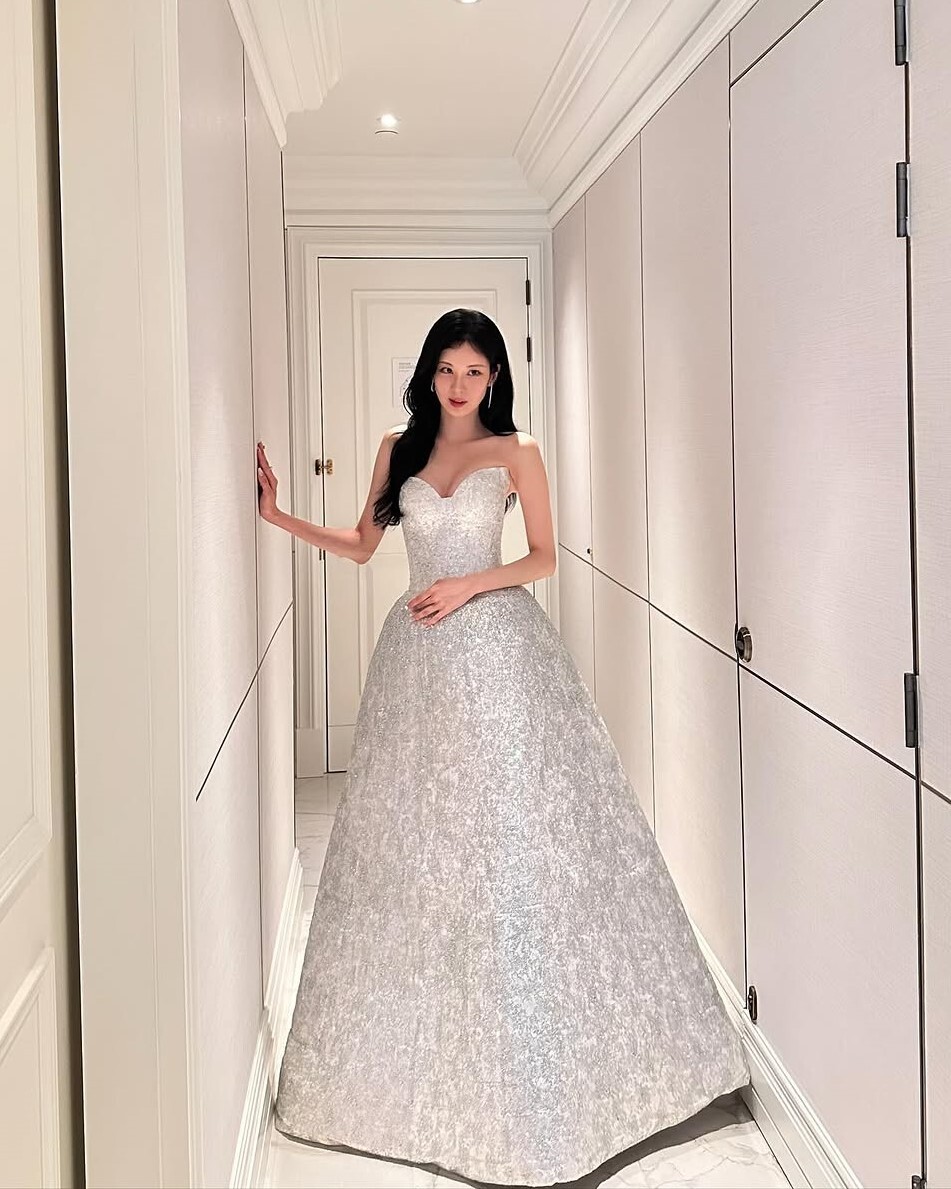 특히 풍성하게 퍼지는 스커트 라인은 클래식한 매력을 더했으며, 긴 웨이브 헤어와 미니멀한 액세서리는 서현만의 고급스러움을 극대화했다.