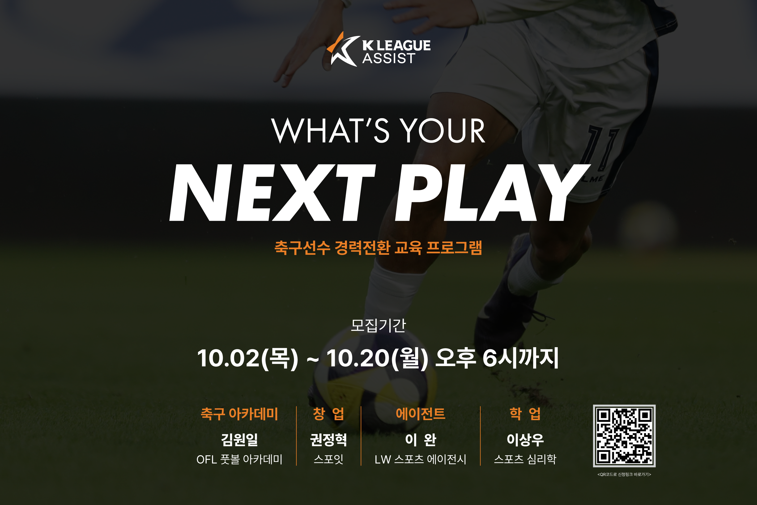 ‘넥스트 플레이’ 모집 기간은 이달 2일부터 20일까지이며, 지원 자격은 K리그1, K리그2, 혹은 K3리그, K4리그 등록 선수 및 대학 선수 가운데 은퇴했거나 은퇴를 앞둔 자다. 지원은 ‘넥스트 플레이’ 홍보 포스터 내 QR코드를 통해 접속한 후, 네이버폼 지원서를 작성해 제출하면 된다.