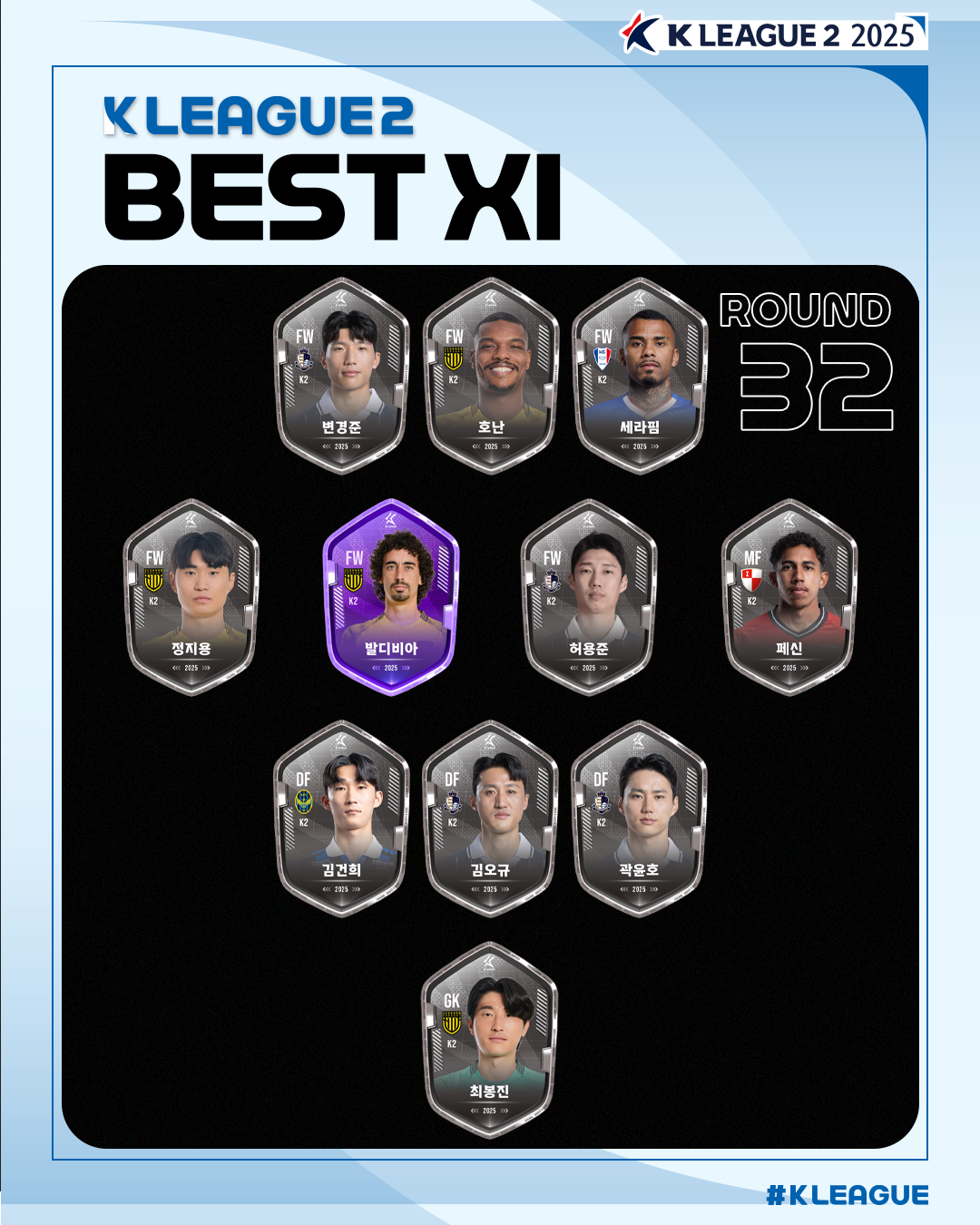‘하나은행 K리그2 2025’ 32라운드 MVP는 전남 발디비아가 차지했다. 발디비아는 5일 광양축구전용구장에서 열린 전남과 천안의 경기에서 1골 2도움을 기록하며 전남의 4-1 승리를 이끌었다. 전남은 발디비아 외에도 호난, 정지용, 최봉진이 라운드 베스트11에 이름을 올리며 K리그2 32라운드 베스트 팀에도 선정됐다.