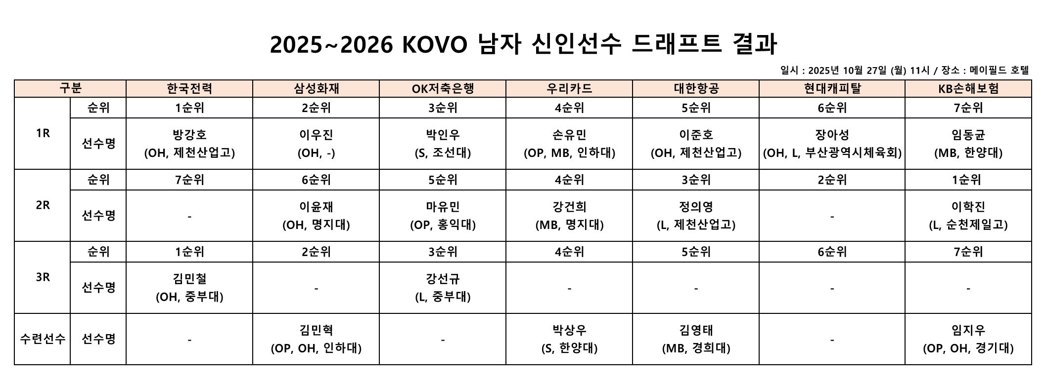 한국배구연맹(KOVO)은 27일 서울 강서구 메이필드호텔에서 2025~2026 KOVO 남자부 신인드래프트를 열었다.
