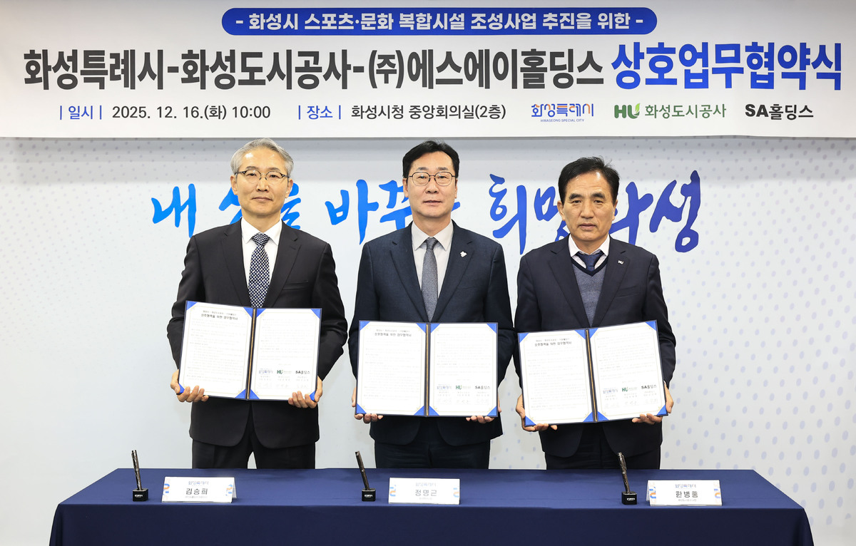 화성시(시장 정명근)와 화성도시공사(사장 한병홍)는 16일 화성시 석우동 58번지 일대 유휴부지 등에 민간사업자인 ㈜SA홀딩스와 ‘AI를 활용한 스포츠·문화 복합시설 조성사업’을 위한 3자간 업무협약을 체결하고, 스포츠를 기반으로 한 새로운 도시 플랫폼 구현에 협력하기로 했다.
