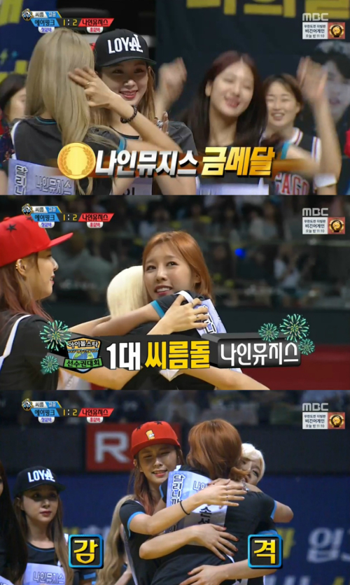 그룹 나인뮤지스가 에이핑크를 누르고 ‘아육대’ 씨름 종목 첫 금메달을 차지했다.