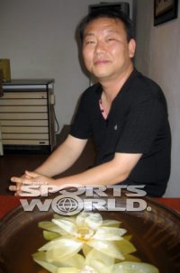 | 수제 연꽃차 가공업체인 어울러 영농조합법인 방현봉 대표가 연꽃차를 앞에 두고 기념촬영하고 있다. |