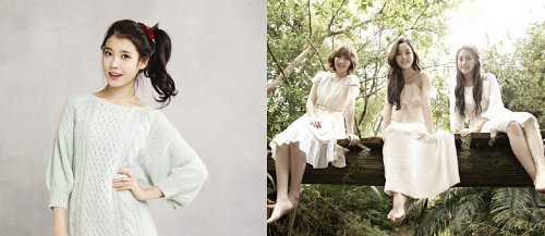 | 한국화장품 '더샘' 모델 '국민 여동생' 아이유(왼쪽)과 네이처리퍼블릭 모델 걸그룹 '카라'의 강지영, 구하라, 박규리(왼쪽부터) |