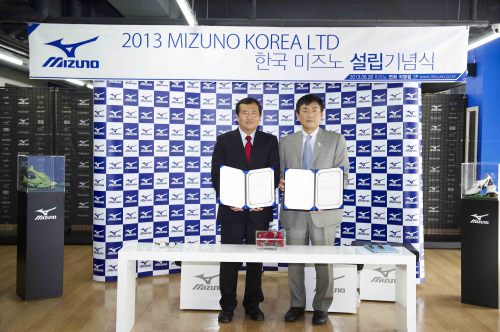| 김창범 미즈노 코리아 대표(왼쪽)가 자사 설립을 위한 협약식을 마친 뒤 기념촬영하고 있다. |