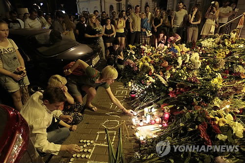 | 말레이시아항공 보잉777 여객기가 17일(현지시간) 우크라이나 동부에서 미사일에 격추돼 승객과 승무원 298명 전원이 사망한 가운데, 우크라 수도 키예프의 네덜란드 대사관 앞에서 시민들이 희생자들을 추모하는 촛불을 밝히며 헌화하고 있다. |