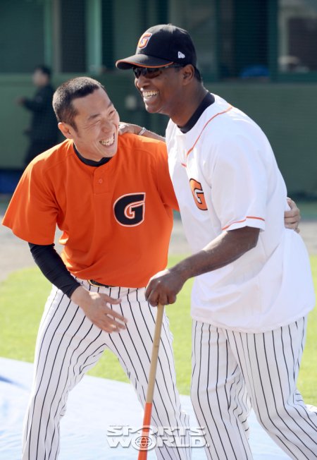 | 프로야구 롯데의 로이스터감독(오른쪽)이 사직구장에서 열린 한화와의 홈 경기 전에 정수근과 장난을 치고 있다. 사직=김두홍 기자 kimdh@sportsworldi.com |