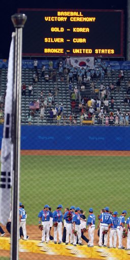 | 지난 23일 열린 베이징올림픽 야구 쿠바와의 결승전에서 승리한 한국 대표팀 선수들이 시상식을 마치고 경기장을 나서고 있는 가운데 전광판에 한국의 금메달 소식이 전해지고 있다. 연합뉴스 |