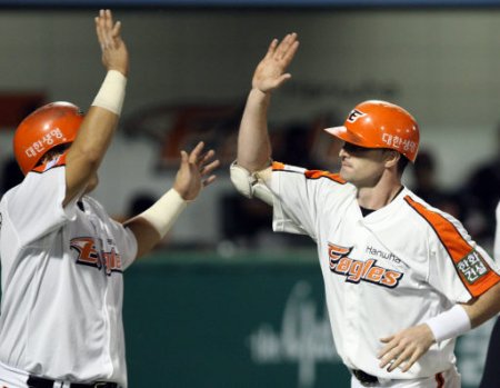 | 프로야구 한화의 클락(오른쪽)이 17일 대전구장에서 열린 롯데와의 홈 경기 6회말 무사 상황서 만루 홈런을 때려낸 뒤 홈서 김태균과 하이파이브하고 있다. 대전=연합뉴스 |