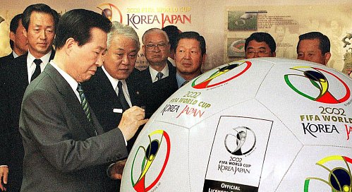 | 2002 한·일 월드컵축구 대회조직위원회를 방문, 준비 현황을 보고 받은 뒤 대형 축구공에 기념서명을 하고 있는 故 김대중 전 대통령(왼쪽). 세계일보DB |