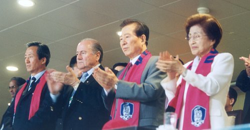 | 故 김대중(오른쪽 두 번째) 전 대통령과 이희호 여사(오른쪽)가 2002년 6월25일 서울월드컵경기장에서 열린 2002 한·일 월드컵축구 준결승 한국과 독일간 경기를 정몽준 국제축구협회(FIFA) 부회장(왼쪽), 제프 블래터 FIFA 회장(왼쪽 두번째)와 함께 관전하던 도중 박수를 치고 있다. 대한축구협회 제공 |